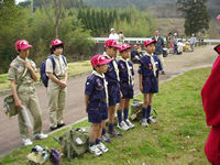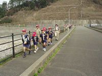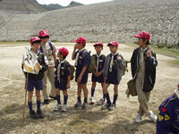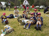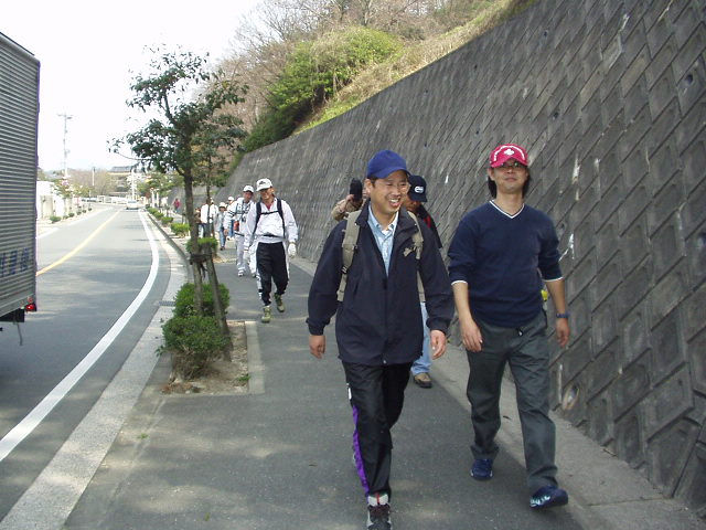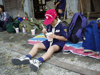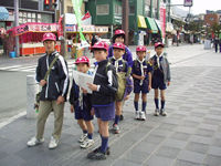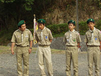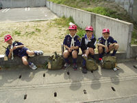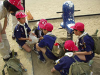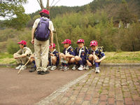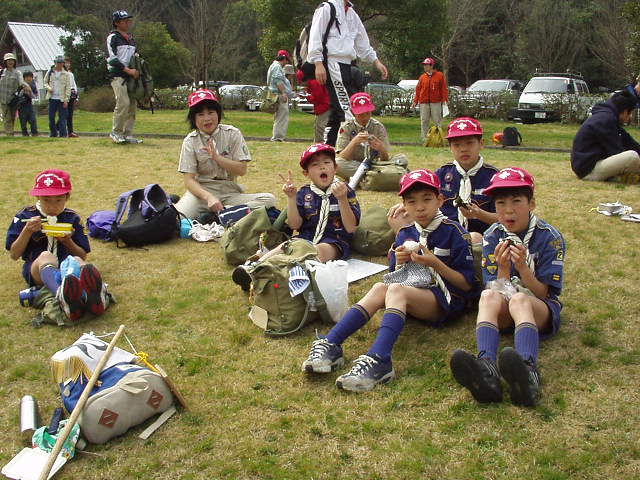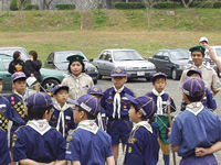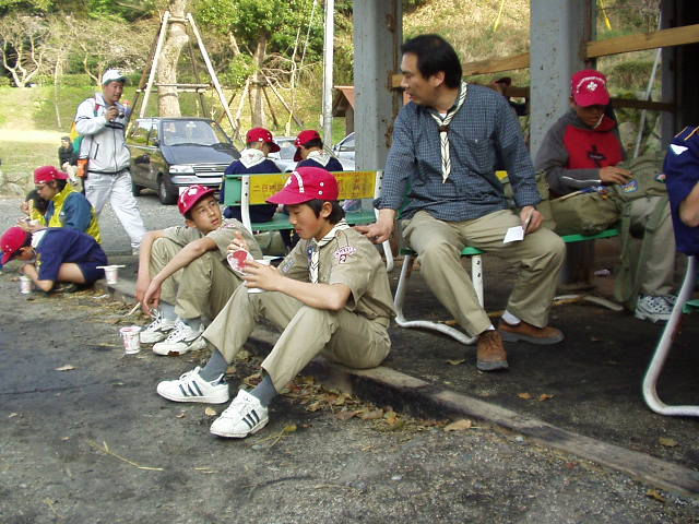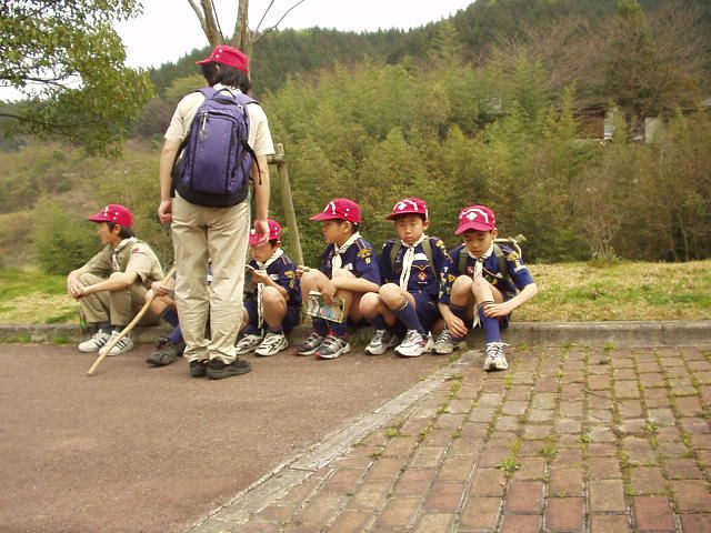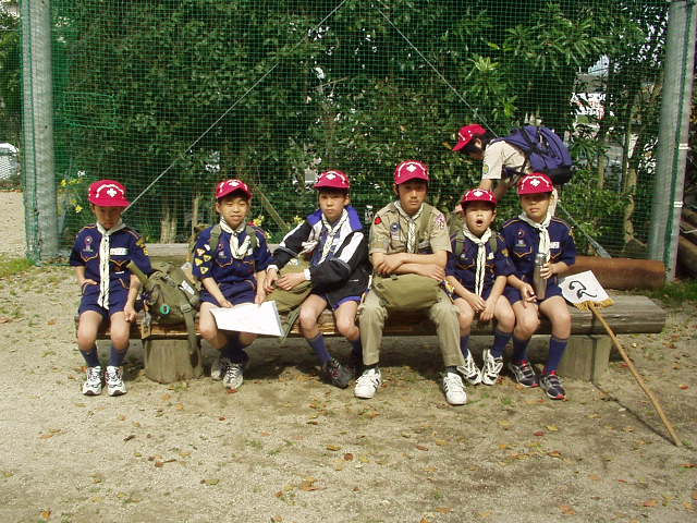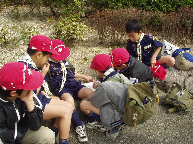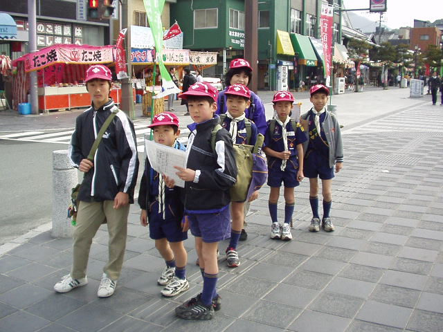 今日デンコーチをやってくれるボーイ隊のお兄さんたち。 | 参堂を抜けてちょっと信号待ち。 | 第1のチェックポイント大宰府市民プール。20秒で置いてあった物20個を覚えるキムスゲームだ。 |
