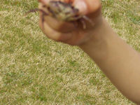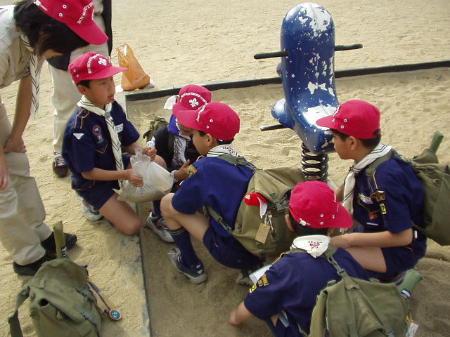 ここからゴールまでは隊長と一緒だよ。 | 第5チェックポイントの近隣公園。バナナと同じ重さの砂を袋に入れます。2組が1番近い値でした。 |