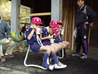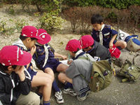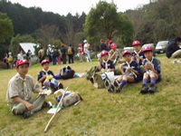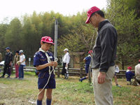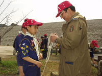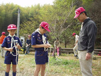 馬力がかかって保護者の組を抜きました。お先! | 第2チェックポイントの牛頸ダムに到着。 | 鹿の課題は「もやい結び」です。紳太君ガンバレ! |