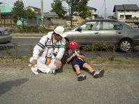 第4チェックポイントの平野神社で手旗ダンスを無難に終え、しばし休憩。さすがは手旗賞受賞組! |
