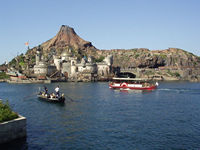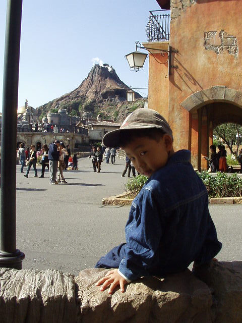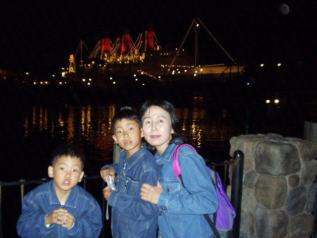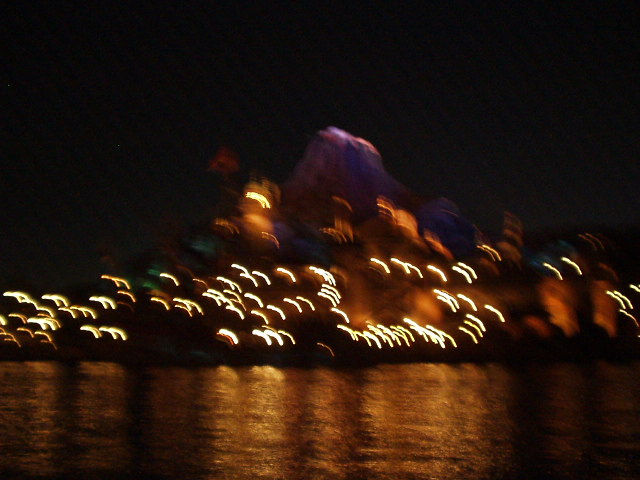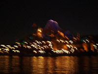 ウオーターフロントに有るコロンビア号をバックに。 | 夜8:10からのディズニーシー・シンフォニー。すごい混雑で、見えたのは高楼からタクトを振って演出するミッキーだけでした。 | 夜の地球儀もキレイでした。水が上から流れている様に見える仕掛けはどうやってるの? |