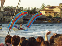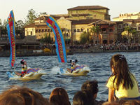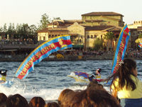 軽快にモーターボートを乗り回すミッキーとミニー。 | スピードが速くてシャッターが間に合いません。 | やっとミッキーを捉えることが出来ました。 |