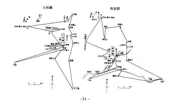 大和郡 (北の笠置〔笠置山〕からはじまって、同じく時計の針の方向 と逆に一周すれば) 笠置(笠置山)→春日→三笠山→住吉(墨江)神杜→平郡(へぐり)→池田→三井→ 織田→三輪→雲梯(うなで)→大和高田→長谷山→賀美(上)→朝倉→久米→水 間(みずま)→天の香山(高山)→高取山→天ケ瀬(あまがせ)→国樔(くず)→烏 見山→上山田→山田→田原→笠置山。 ■ 夜須郡(北の笠置山からはじまって、時計の針の方向と逆に一周すれば) 笠置山→春日→御笠山→住吉(墨江)神杜→平郡(へぐり)→池田→三井→小田→ 三輪→雲堤(うなで)→筑前高田→長谷山→加美(上) →朝倉→久留米→三潴(み づま)→香山(高山) →鷹取山→天瀬(あまがせ)→玖珠(くす)→鳥屋山→上山田 →山田市→田原→笠置山。 ○ 「魏志倭人伝」の国名と「延喜式」の郡名との統計的な合致度は、九州 地方が最も大きく、そこから離れるにつれ小さくなる傾向が認められ る。 ○ 「高天の原」と「天照大御神」「高天の原=邪馬台国」 ・