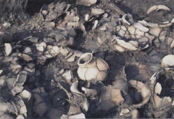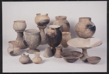 多重の生活土器のほか、鍬・鋤などの農耕具、網枠、木製生活用具、玉類、広型銅矛耳部、銅鏃、中国貨幣(貨泉)、小型?成鏡、「長宜子孫」銘内行花文鏡片など。 |