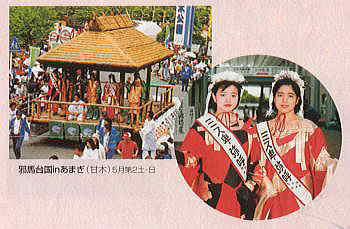 昭和61年に甘木鉄道の開業を記念して「花の邪馬台国まつり」として始まりまりした。我が町をわれらみんなの手でつくろうとする熱意は、邪馬台国ロマンとともに市民祭/の誕生をもたらした。平成6年には卑弥呼時代の多重環濠遺跡「平塚川添遺跡」が国指定遺跡となり、邪馬台国甘木説もいよいよ鮮度を深めてきました。 邪馬台国を基調とするこの祭りは、年に1度の市民総出の祭りとして、また、市内企業の交流の場として、そして、甘木市の歴史をアピールする祭りとして毎年5月の第2土・日にピーポート甘木をメイン会場にイベント・パレード・コンテスト・物産市と多彩な内容で開催されています。 ※ ミス卑弥呼 |