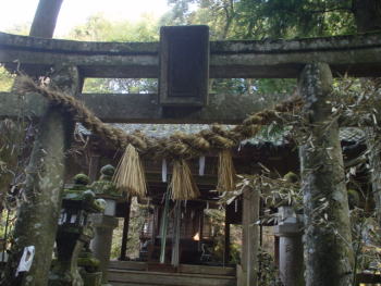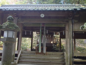 | 大山の産神として大山祗命を祀る。鎮座の始めなどは詳かでない。明和3年(1766)正月と銘のある木像御神体、日田郡大肥庄、半田覚兵衛作があり、これと並べてある古い木像のある所から想像するに、約四百年位前即ち針目山落城のころに作られたものと思われる。 そしてその御神体が古びて、形もわからなくなったため二代目の御神体が作られたものであろう。 なお、本杜の例祭に「おしろい祭」の奇習がある。奇祭「おしろい祭」も、そのおしろいにその年収穫した新穀を用いる所に意義があるのであろう。 |
