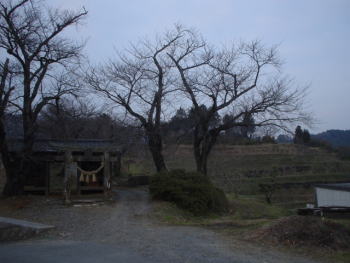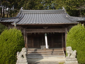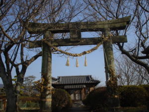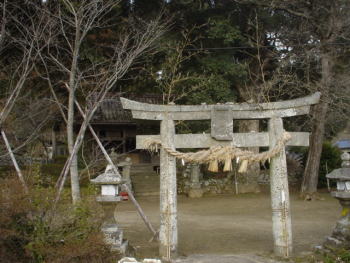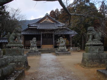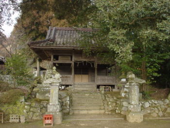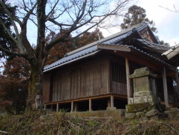 | 本社は古賀の産土神にして、昔は奥の方夕月という藪の中に鎮座ましましたが、余りにも村に遠く産徒の参詣にも不便であると、元文2年(1738)浦山と言われる現在地に遷座された。 勧請の初めその他は一切不明である。境内並びに参道には桜が植えられている。 |
