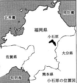 小石原村は、福岡県の東部に位置している。福岡県の東部と大分県の北部と接しているところの英彦山の西側にあたる。標高約480m、小石原地区は東西に約10q、鼓地区は南北に約12qあり、ちょうど英字の丁の字形をした総面積約29,370haの小さな山村である。 山林・原野・池沼が総面積の約60%を占めている。山林は、大部分が人工林でスギ・ヒノキなどである。樹齢200〜500年といわれる行者の杉は約10haの中に1000本以上のスギある。 小石原には、自然林もわずかに残っており、植物や動物も種類が多いので生物学的にも面白い。 小石原村は、小石原地区と鼓地区とに分けられる。 英字Tの字の横棒にあたる部分が小石原地区で縦棒にあたる部分が鼓地区である。それぞれ地形的に大きな差異があり、地理学的にも面白い。 小石原地区は、標高約480mの所に、かって湖底であったと思われる盆地になっている 鼓地区は、断層に沿ってできた大肥川が形成した直線的な谷になっている。小石原地区の東方には、標高約1.200mの英彦山があり・皿山・行者の杉からすぐ側に展望できる 小石原地区東部には標高約980mの馬見山があり、英彦山一馬見山一古処山縦走コースとして登山者に愛好されている。南ノ原の南方向に標高約748mの白石山がある。 鼓地区は、東西には、最大でも約4kmの幅しかなくほぼ中央ある谷に大肥川が流れている。