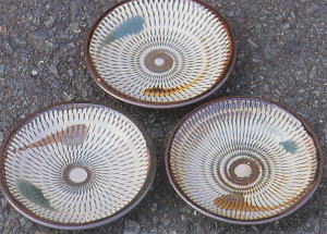 小石原には50軒にのぼる窯元が点在し、特に国道211号線沿いと皿山地区に集中しています。 1682(天和2)年、黒田三代藩王光之が、小石原中野に肥前伊万里の陶工を招き、大陸風の磁器を伝え、この頃すでに小石原にあった高取焼と、この窯が交流することにより、小石原焼は形成されていきました。18世紀半ばから名前も中野焼から「小石原焼」と坪ばれるようになったようです。 かつては皿山を中心に、9戸の共同窯による世襲制をとり、大正から昭和のはじめ頃までは英彦山参拝のみやげの徳利や大型カメ、鉢、皿、すり鉢などの荒物製品づくりがほとんどだったそうです。やがて民陶ブームの到来に従って共同窯は解消し、個人窯元が増え、小物づくりなども活発化しました。 昭和33年ブラッセルで開かれた世界工芸展でのグランプリ受賞、昭和36年の日本工芸館小石原分館の設立も今日の小石原焼発展に弾みをつけたようです。そして昭和50年には通産省の伝統工芸品に指定されました。 生活雑器としての道を歩みながら、用と美を確立した小石原焼には、飛びかんな、はけ目、化粧掛け櫛描、指描、打掛け、流し掛け、生掛けなどの独特の技法が生きています。そして、それが素朴で温かい持味を出しているのです。多くの後継者や窯元は、そんな伝統の技を大切に受け継ぎながら、小石原焼の発展を願ってさらに新しい作風の確立をめざしています。 |