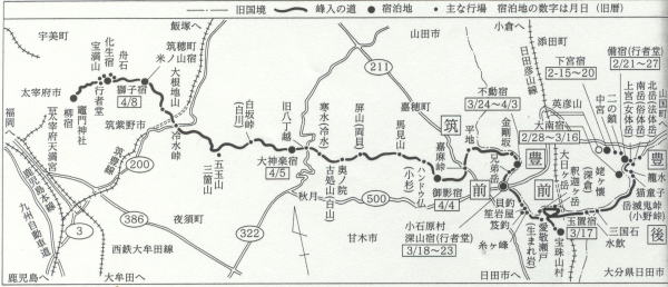 鼓の小野谷を登った所にあり豊前境の尾根筋から少し下ったところに高20mばかりの大岩が東西に並んでいる。“生れ岩"という。岩の間は30〜90cmほどあろうか。新入りの山伏は腰に縄をつけ、このすき間から降ろされたという。 この行を“生れ直し"といったので生まれ岩の名が残ったのだろう。近くに山の斜面に突き出た巨大な岩(男岩)がある。