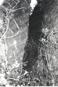 生まれ岩から尾根伝いに北へ一時問、道幅が極端にせまく、左右が急傾斜になった崖に差しかかる。剣の刃の上を渡るような気持ちで、雑木の枝やロープを頼りながら、やっとの思いで20mの剣路を行く。ここが山伏たちに恐れられた糸ケ峰だろうか。 そこから約50mおきに、険しい岩山をニカ所越える。これが、山伏たちが笈(おい)と貝とを持っては歩けず、首に吊り下げて通ったという笈釣・貝釣の難所だろう。 |