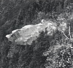 笈釣・貝釣より花園の滝の方へ少し下ったところに高さ20mほどの大岩がそびえる。地元の人は観音岩と呼ぶ。その下方にある大きな洞窟が笙の窟である。 60人は入ると古文書は書いているが、今は天井が崩れ落ちて狭い。ここでも山伏たちの修行は行なわれた。笙(竹の笛)をふき、踊りを舞って楽しんだという。 |