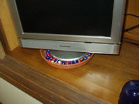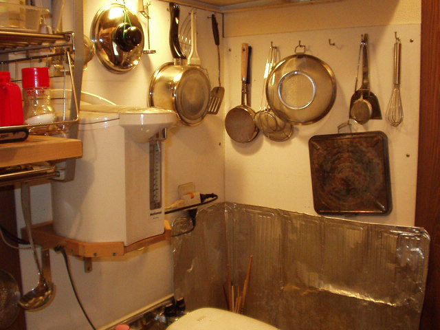 テレビの下には園芸用の皿の中にビー玉が敷き詰めてあり、自由に回転出来ます。便利なターンテーブルが材料費100円で完成! | 反対側には照明やエアコンなどのスイッチがまとめて配置してあります。 | 次は台所。いつも使う道具が壁にきちんと並んでいます。 |