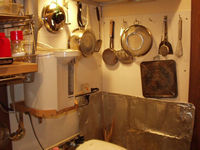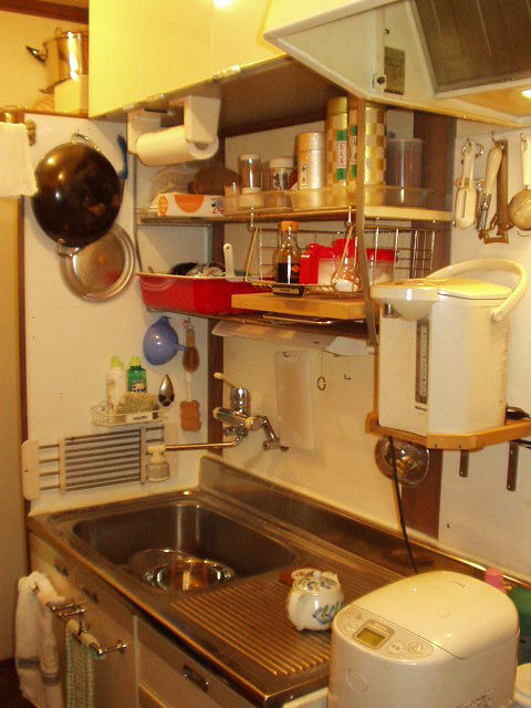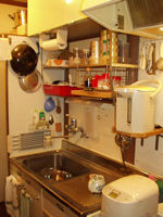 流しの上にも棚が作られキレイに収納されています。 | 反対側には食器を入れる棚が設けてあります。 |