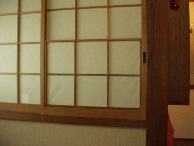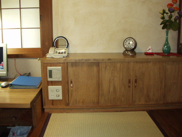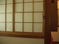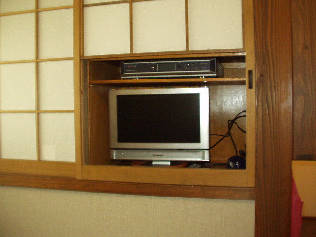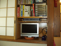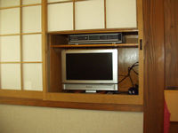 一見すると普通の障子ですが・・・ | 上にスライドさせるとテレビが現れ、 | 更にスライドすると上は収納スペースです。 |
