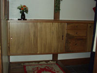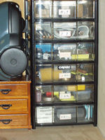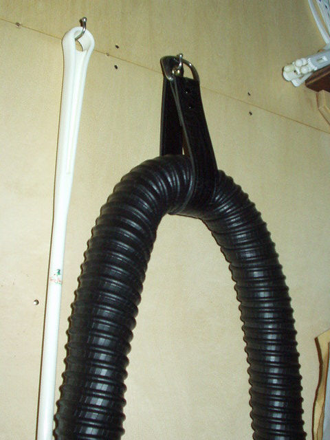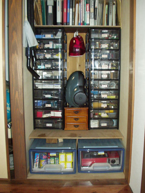 次に押入れのふすまを開けると収納用の引き出しに道具がきちんと収めてあります。 | 下の棚板は真ん中に支柱があり、人が乗っても大丈夫です。 | これはベルトを利用した掃除機用のホース掛け。幅が広いのがミソ。 |