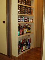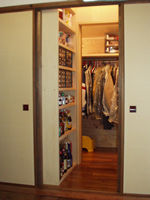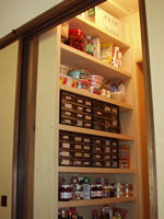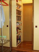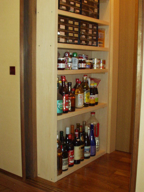 中は収納スペースで、 | ここにも棚が設けてあり、 | 下の段には落ちると危ないビン類が、 | 上の段には軽い物が置いてあります。 | 更にその奥も広いウオークインクローゼットと押入れになっています。 |