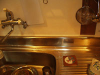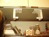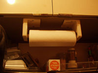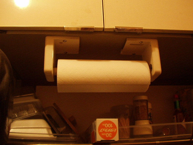 キッチンタオルも自由に引き出せます。仕掛けは・・・ | トイレットペーパーのホルダーを半分に切って取り付けただけです。 | 流しの周りと壁の間はパテで埋めてあるので、水をかけて洗ってもOK。 |