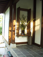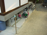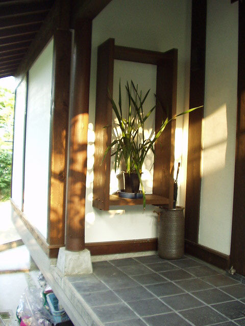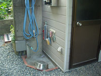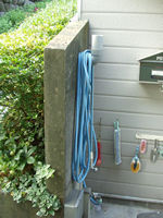 作業場の柱は掃除がしやすいように寸止めに(床から浮いています)。 | ホースにクセがつかない様に考慮された太目のハンガー。よじれ防止の為に、巻くのではなく、左右に振り分けて掛けてあります。 | 玄関には観葉植物を置ける様にしゃれた飾り枠が。 |