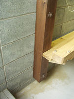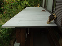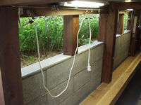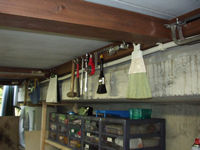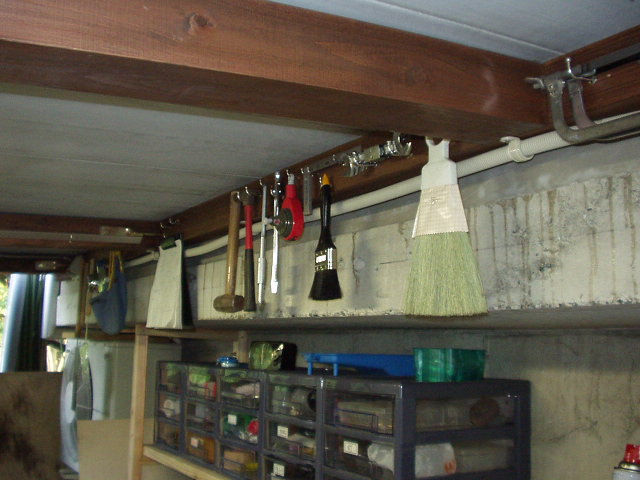 カンナをかける台の上に設けられた電源コード用のレール。 | この作業場の上は、雨よけ兼ベランダです。 |