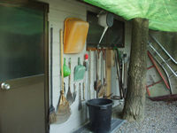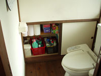 トイレも引き戸を開けるとちゃんと収納スペースがあります。 | 玄関の下足箱の下は、掃除がしやすいようにスペースが。 | このポールは物干し竿です。中にセメントを詰めて補強してあります。 |