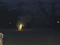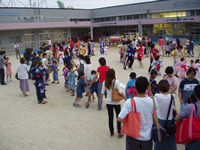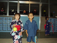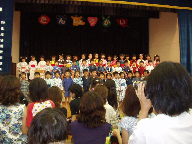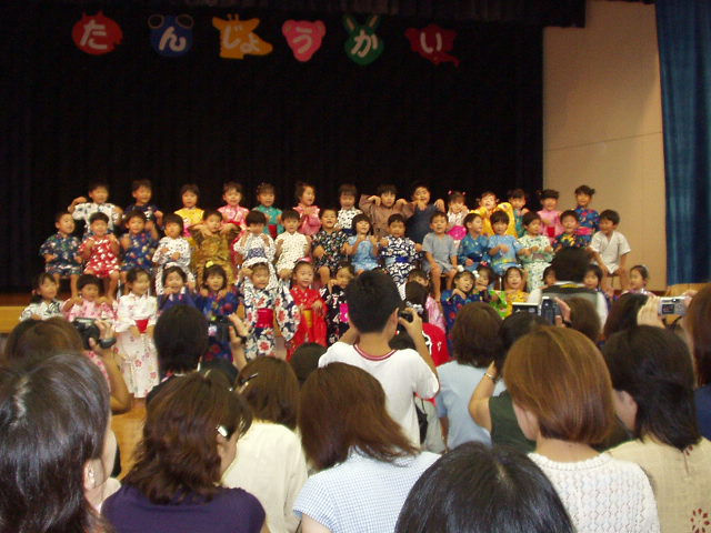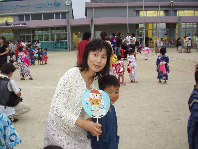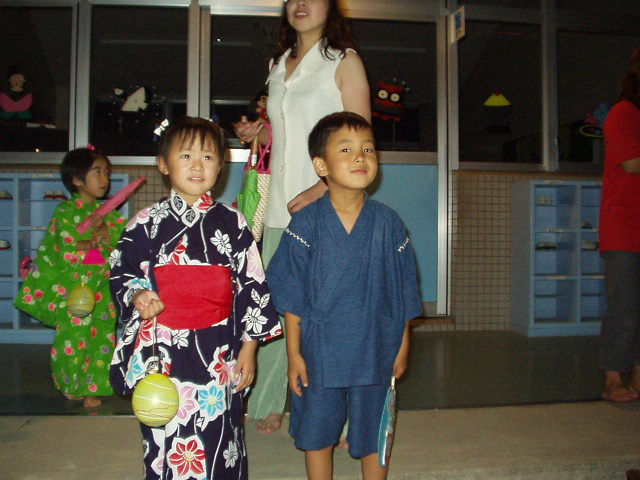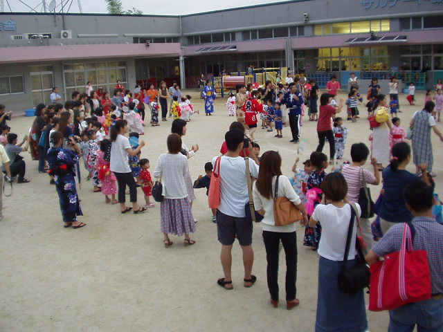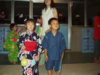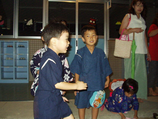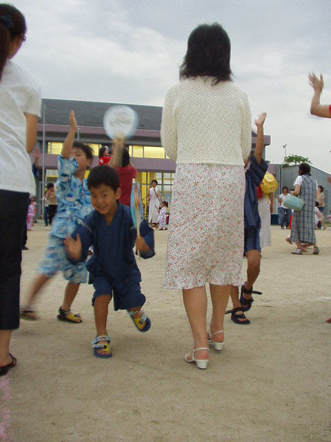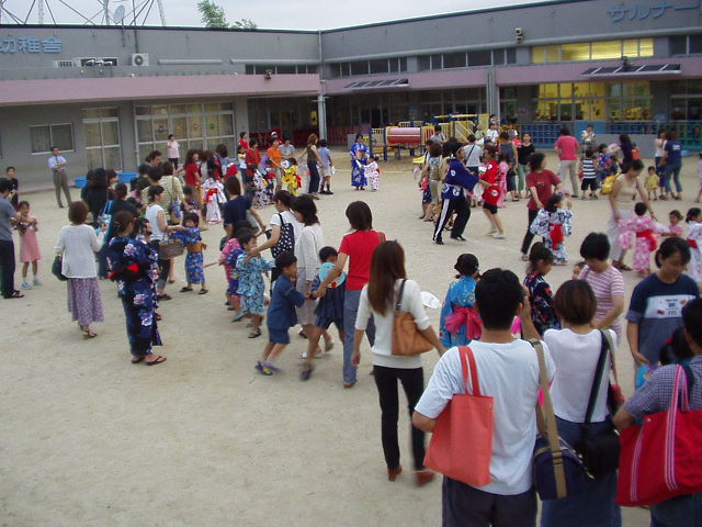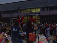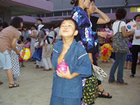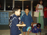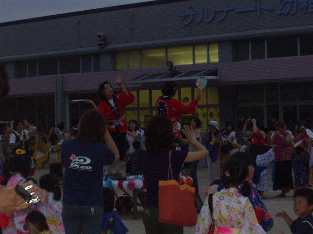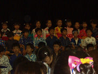 「たんじょうかい」ではありません。夕涼み会です。 | 幸い雨が上がったので踊りは外になりました。 | 次はお母さん達と一緒に踊りました。 |