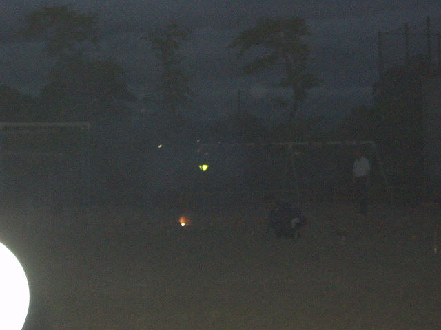 踊りが終わったらヨーヨー釣りがありました。「難しかった〜」 | 未だちょっと明るいけど次は花火です。 | OBの福田先生も準備を手伝ってくれました。先生ありがとう。 |